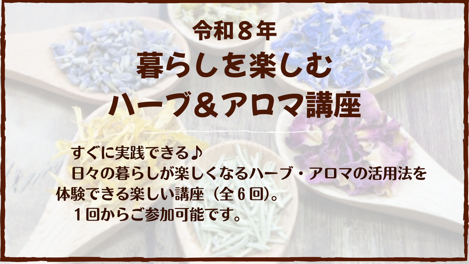 2026-02-11 / 最終更新日時 : 2026-02-11 かずねえ 令和8年度 ハーブスクール無料体験説明会のご案内 【ハーブ講座初級コース 無料体験説明会】 令和8年5月開講予定 ハーブの栽培法や利用法(料理、ハーブティー、スキンケア、ヘルスケア、クラフト等)について、実習しながら楽しく学ぶ講座です。 修了後の資格試験(任意)に […]